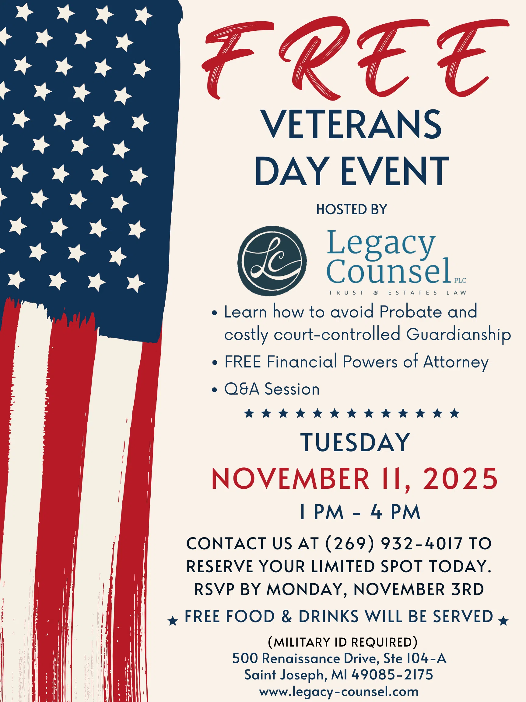 This Veterans Day, Legacy Counsel PLC proudly honors our local veterans by offering a special estate planning event in Southwest Michigan. This event is specifically for area veterans who want to protect their families, simplify their estate planning, and gain peace of mind.